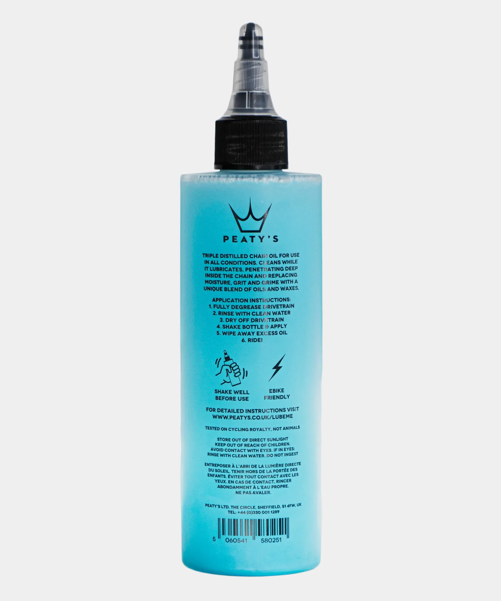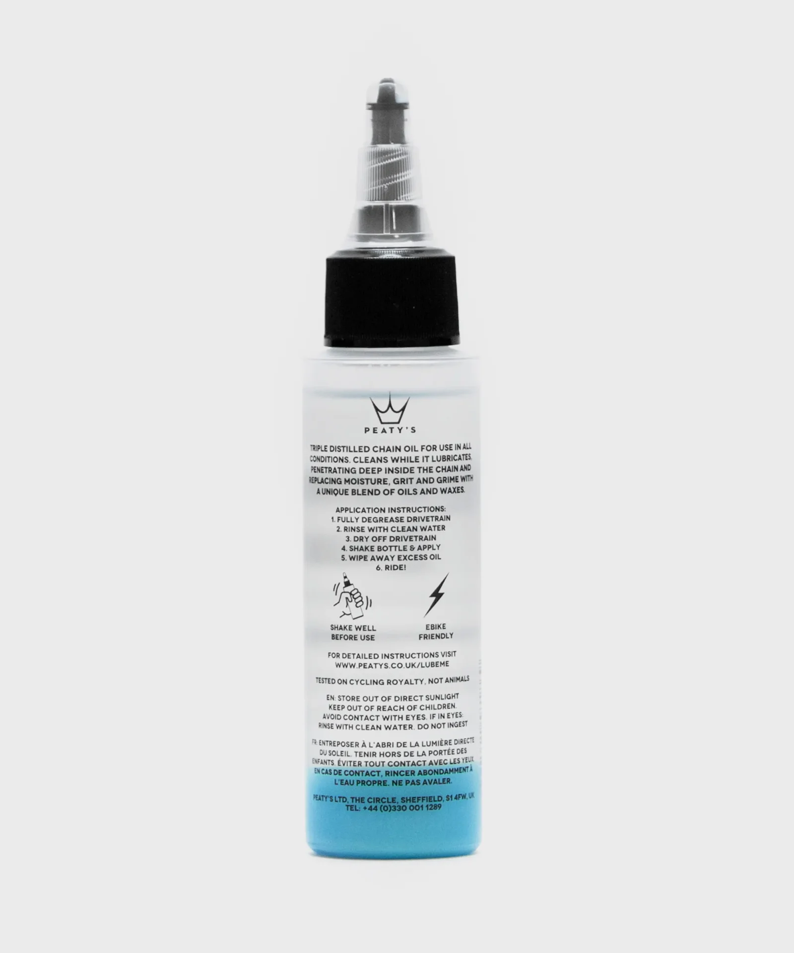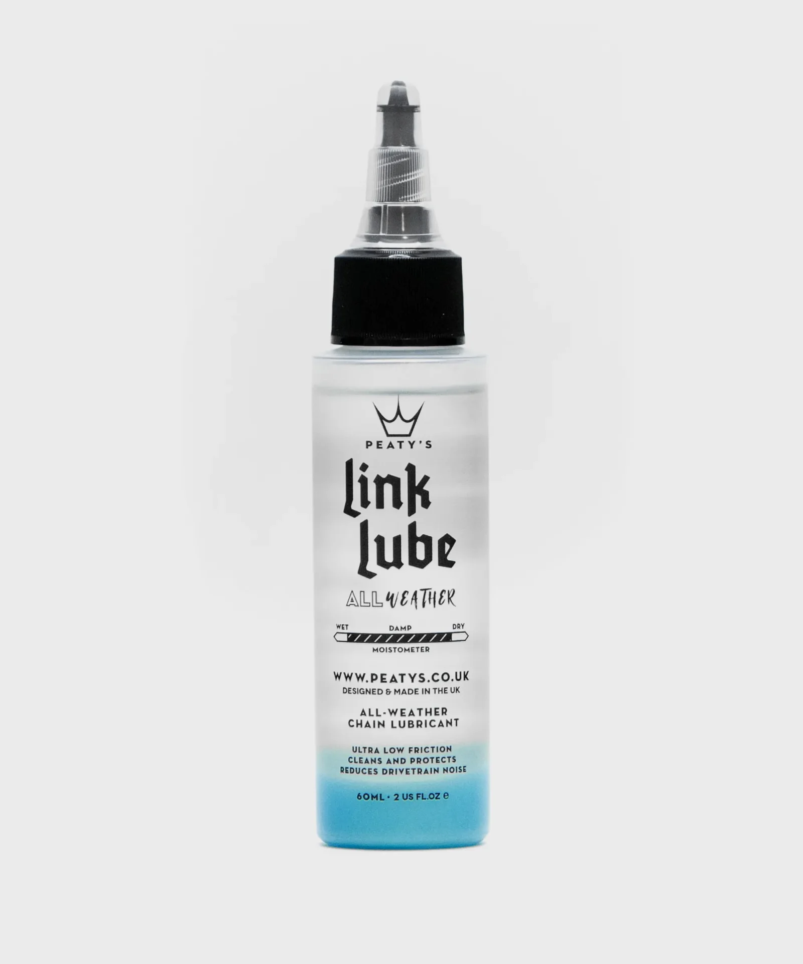 Peaty’s LinkLube features a unique two-part formula: a clear base lube and a blue “secret sauce.” When left to settle, the base oil floats atop the special compound of waxes and oils, creating a perfect blend for all-weather protection. Shake before use to combine: