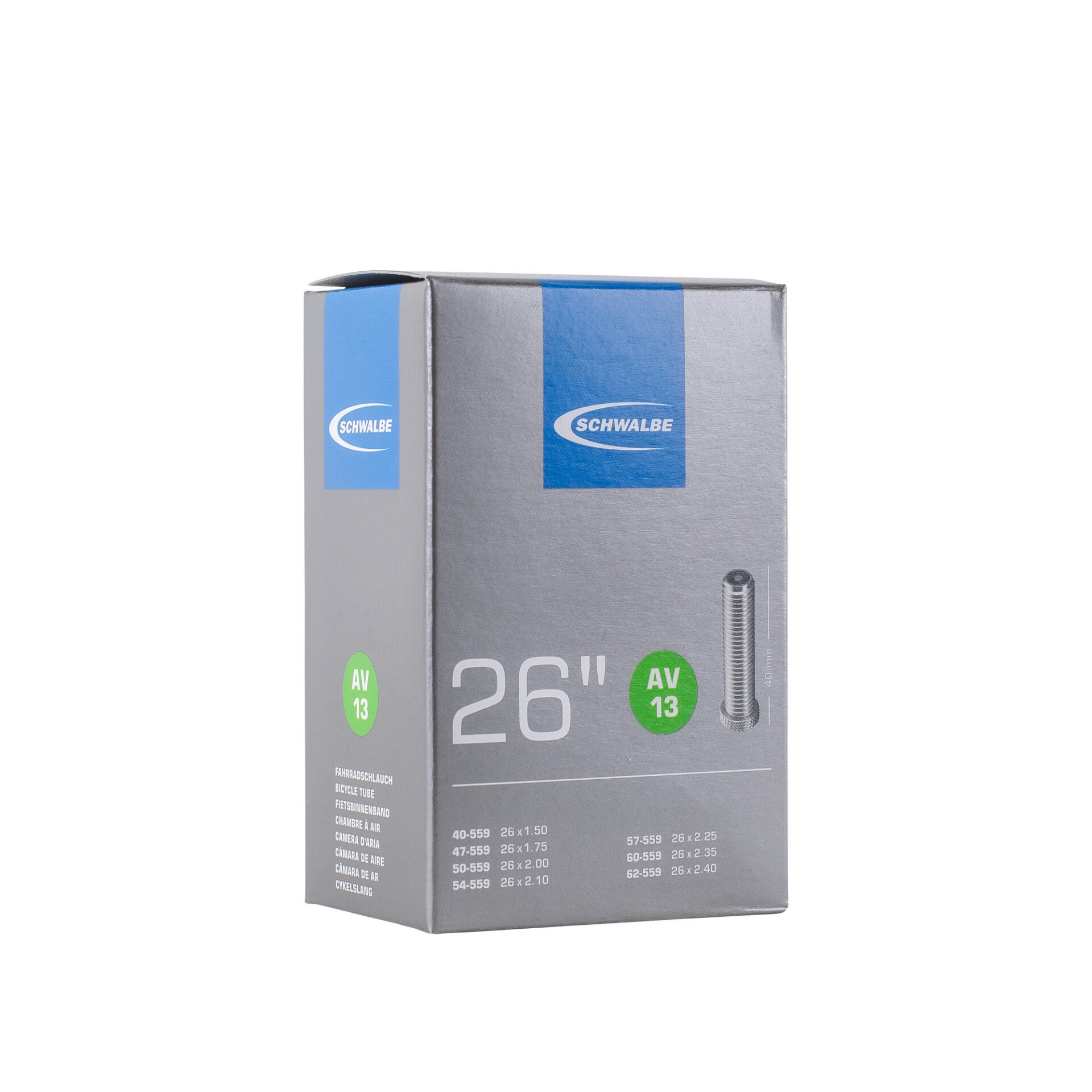 The Schwalbe AV13 is designed for 26″ mountain bikes and hybrids, offering dependable performance and air retention. With a 40 mm Schrader valve, these tubes are easy to inflate using standard car-type pumps.